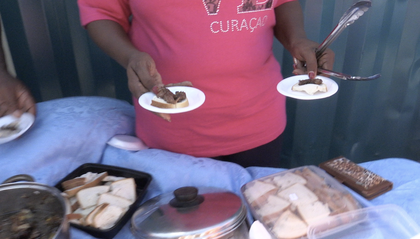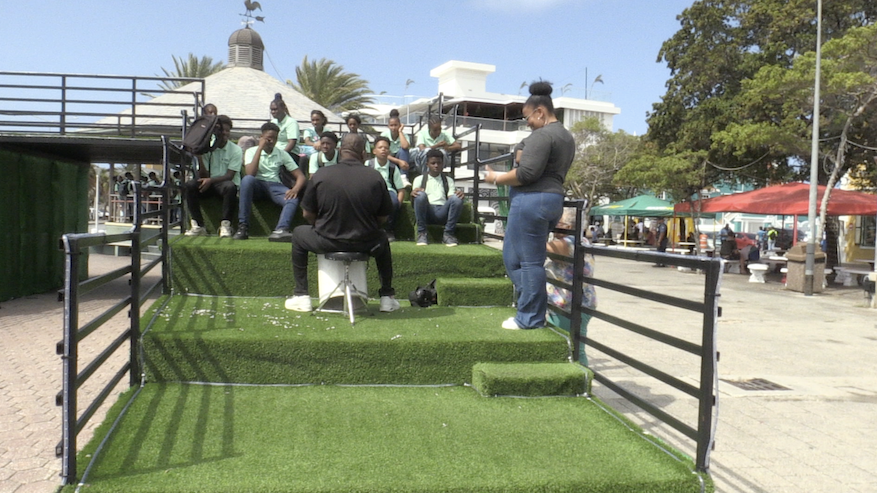 Links onder Percy Holland, begeleiding Prefuru, staat met Monique mee te luisteren naar de zangers.