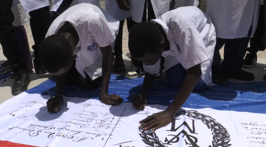 Visitors write their signature on this Dutch flague which shows all the data of the triangular journey of slaveship Hof van Zeeland. A fragment from its logbook is the base of the story of dance film Armazoen.