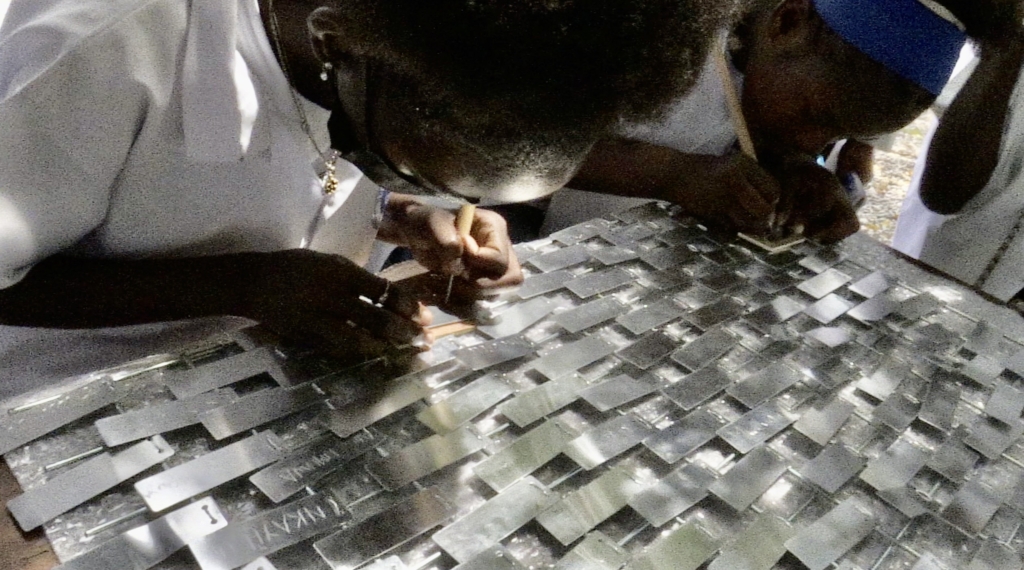Iris replaces a panel with one on which each label is engraved with the name of an Angolan who was made an slave during the transatlantic slave trade.